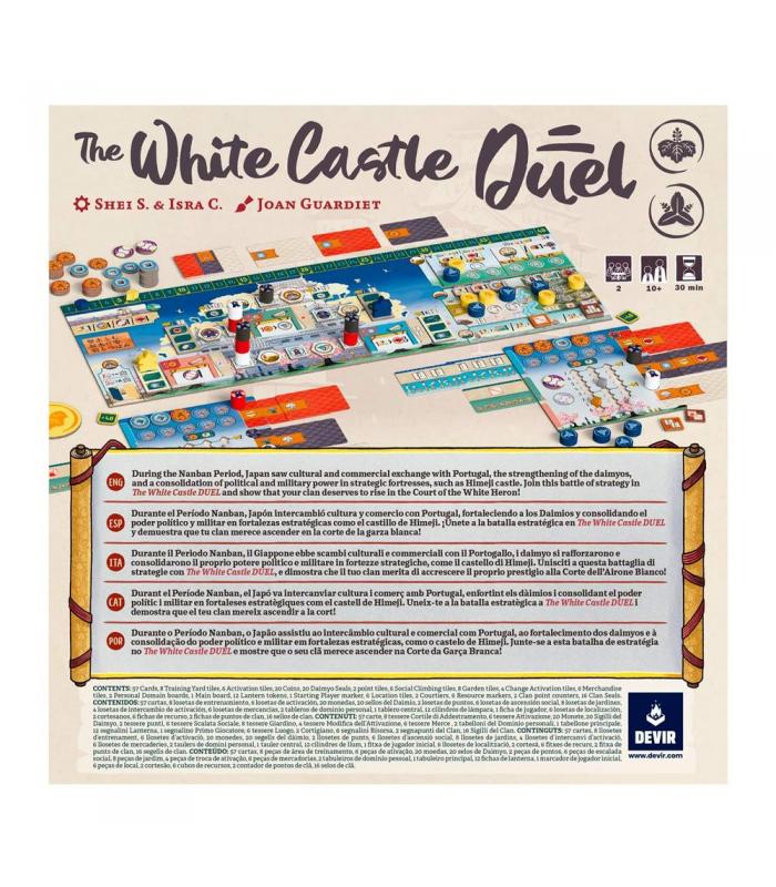¡Vuelve The White Castle en una edición completamente independiente y pensada específicamente para dos jugadores! Cada jugador deberá usar con sabiduría sus cilindros de lámpara para activar las cartas más convenientes y llevar a cabo las acciones óptimas, al mismo tiempo que adquiere las cartas de influencia más beneficiosas y logra los mejores tratos comerciales con los portugueses. Todo ello con el objetivo de lograr más puntos que el clan rival ¿Preparados para volver al castillo blanco y reclamar vuestro lugar junto al Daimio?