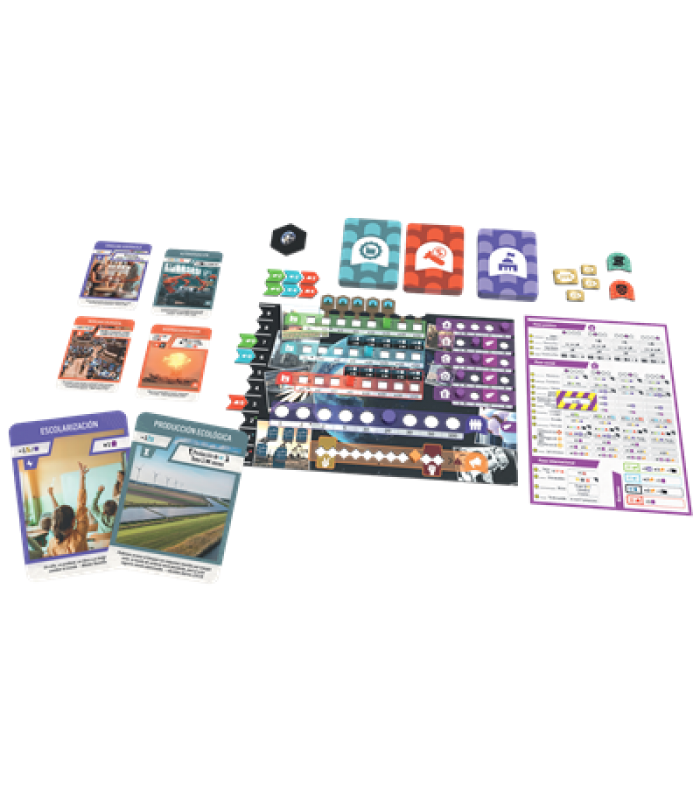 Caja [internacional]: 1 cubo verde de Tasa de recurso renovable, 1 cubo rojo de Tasa de recurso militar, 1 cubo azul de Tasa de recurso industrial, 1 cubo negro de Tasa de recurso fósil, 5 fichas de Recurso fósil, 1 marcador de Liderazgo, 6 fichas de Contaminación, 6 fichas de Inestabilidad, 1 ficha de Territorio, 1 marcador de Desmilitarización, 7 marcadores de Generación, 12 marcadores de Crisis, 4 financieras, 4 militares, 4 ecológicas, 1 marcador de Reserva de colonización, 2 cartas de Reserva de contaminación y Reserva de inestabilidad, 1 carta de Alianza"