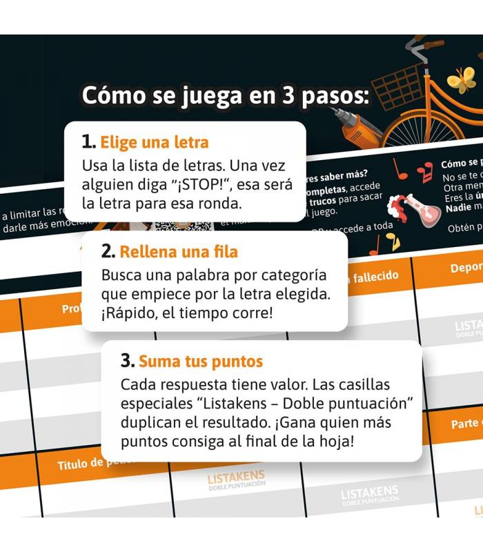 3. Suma tus puntos: Cada respuesta tiene valor. Las casillas especiales Listakens de Doble puntuación duplican el resultado.