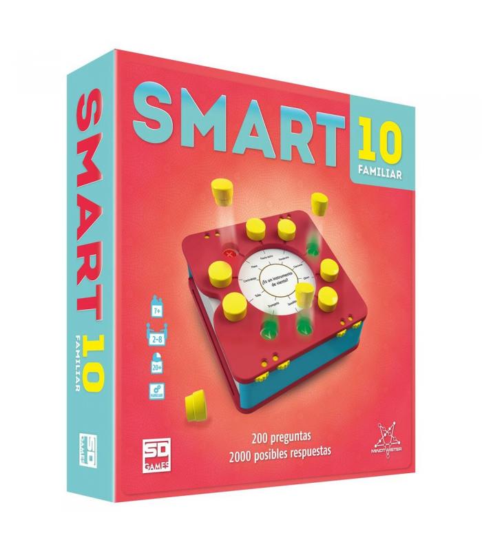 Nuevo diseño de caja, mismo contenido. SMART10 FAMILIAR es la versión para todas las edades del multipremiado juego de preguntas y respuestas en el que todas las personas juegan en cada turno. ¡Tan importante será saber elegir vuestra opción como decidir cuándo plantaros o arriesgar! Cada ronda comienza con una tarjeta que plantea una pregunta con diez posibles respuestas. Las soluciones están ocultas bajo los marcadores, así que... ¿acertaréis o lo perderéis todo? Con 200 preguntas especialmente pensadas para familias, encontraréis retos para peques, mayores y todo tipo de curiosidades. Podéis jugar por turnos, en equipo o mezclando edades... ¡la diversión siempre está garantizada! Contenido: caja Smart, 10 marcadores, 100 tarjetas a doble cara con preguntas, 1 reglamento. Jugadores: 2 a 8. Edad recomendada: +7. Duración de partida: 20 minutos.
