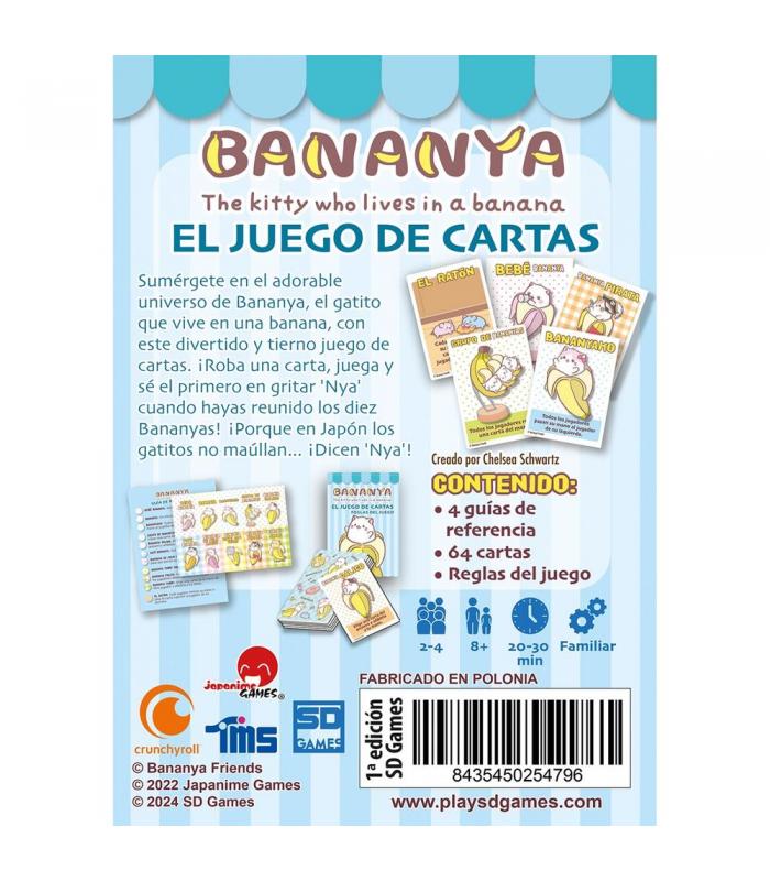 Sumérgete en el adorable y excéntrico universo de Bananya, el gatito que vive en una banana, con este divertido y rápido juego de cartas para toda la familia. Diseñado para 2 a 4 jugadores a partir de 8 años, es ideal para sesiones cortas y llenas de risas. Inspirado en la popular serie japonesa, Bananya: El Juego de Cartas combina mecánicas sencillas con ilustraciones entrañables, perfectas para jugadores casuales, niños y amantes del anime.