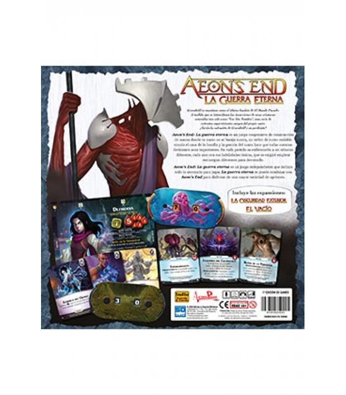 Gravehold se mantiene como el último bastión de El Mundo Pasado. A medida que se intensifican las incursiones de unas criaturas conocidas tan solo como "Los Sin Nombre", una serie de extraños supervivientes surgen del propio vacío. ¿Serán la salvación de Gravehold o su perdición? Aeon s End: La guerra eterna es un juego cooperativo de construcción de mazos donde tu mazo no se baraja nunca, un orden de turno variable simula el caos de la batalla y la gestión del mazo hace que todas vuestras decisiones sean importantes. En cada partida os enfrentaréis a un némesis diferente, cada uno con sus habilidades únicas, que os exigirá emplear estrategias diferentes para derrotarlo. Aeon s End: La guerra eterna es un juego independiente que incluye todo lo necesario para jugar. La guerra eterna se puede combinar con Aeon s End para disfrutar de una mayor variedad de opciones. Contenido juego + Expansiones: 504+ cartas 8 tableros de némesis 12 tableros de jugador 119+ fichas de cartón 2 diales de vida 26 losetas de grieta 7 losetas de terror 1 tablero de terror 1 tablero de grietas 21 separadores para cartas 1 hoja preparación 1ª partida 1 libro de Reglas Edad Recomendada : 14+ Duración Partida: 60 min. Jugadores: 1 a 4