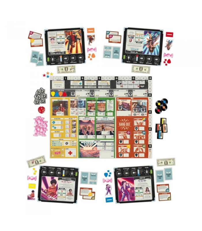 Rock Hard: 1977 incluye numerosos componentes que permiten recrear la progresión de una banda hacia el éxito, con tableros de personaje, cartas, fichas y otros elementos de gestión de recursos.