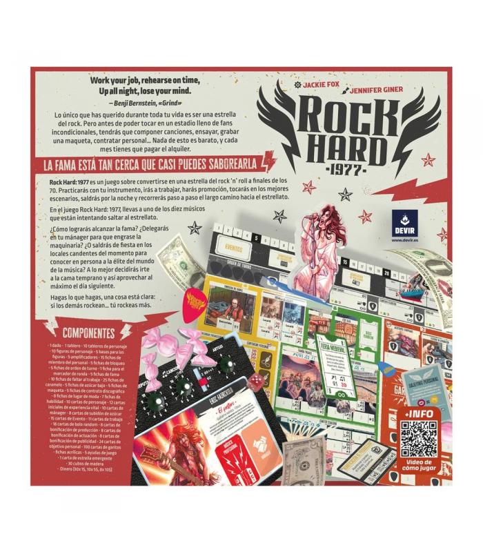 Rock Hard: 1977 es un juego de mesa temático que te transporta directamente a la escena del rock de finales de los años 70. En él te pondrás en la piel de un músico que sueña con alcanzar la fama junto a su banda. Durante varios meses tendrás que ensayar, componer canciones, dar conciertos y promocionar tu carrera mientras gestionas tus recursos y decisiones. Con una buena estrategia y algo de suerte, podrás convertirte en la nueva estrella del rock.
