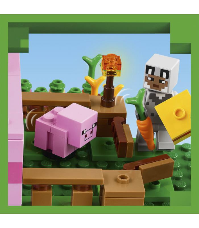 Casa-cerdo bebé al estilo LEGO® Minecraft®: Los peques construyen una casa con forma de cerdo que viene con un huerto para cultivar patatas y remolachas, un campo con una entrada para guiar al cerdo bebé a través de ella y más