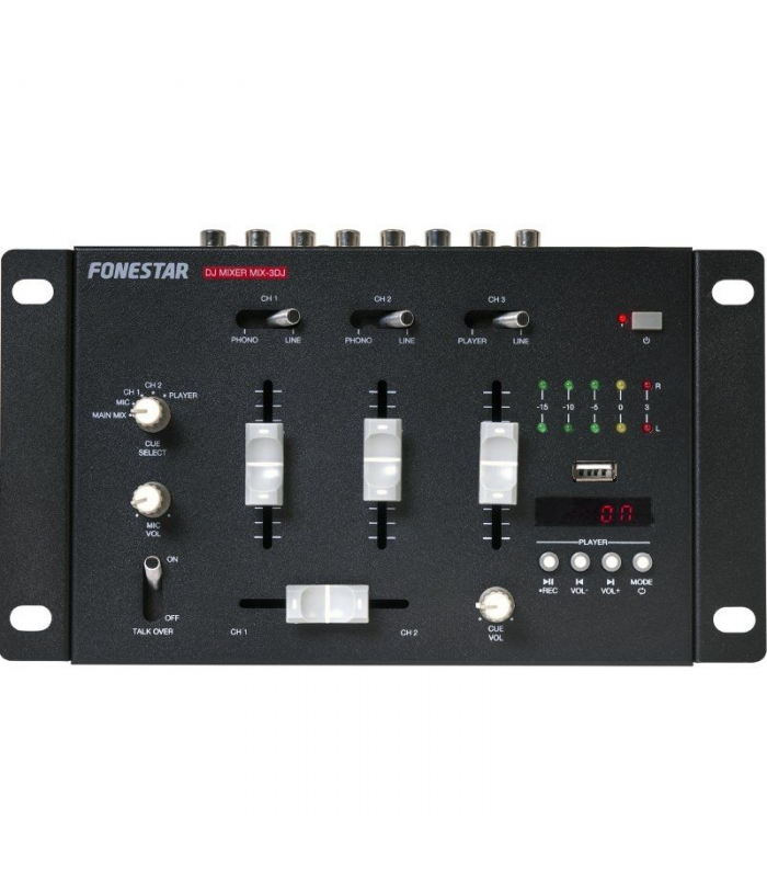 - Mezclador DJ compacto de 3 canales estéreo y 1 micrófono.