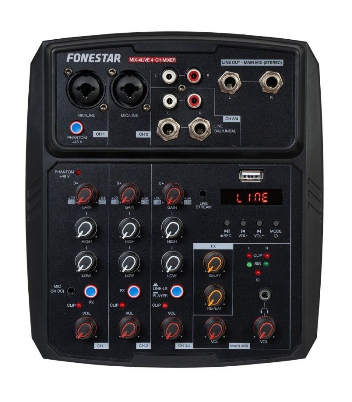 Mezclador estéreo de 4 canales con función live streaming, tarjeta de audio para PC y grabador/reproductor Bluetooth®/USB .