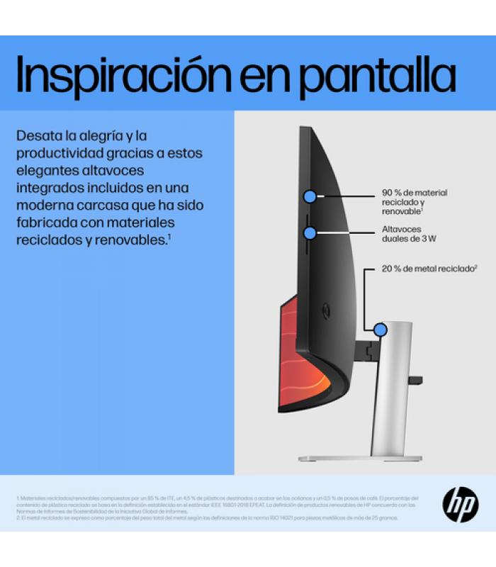 Su base ajustable permite regular altura, inclinación y giro para un confort total. También es compatible con el montaje VESA 100 x 100 mm. HP apuesta por la sostenibilidad, incluyendo certificaciones como ENERGY STAR y TCO Certified Edge Displays, y materiales de bajo contenido en halógenos.