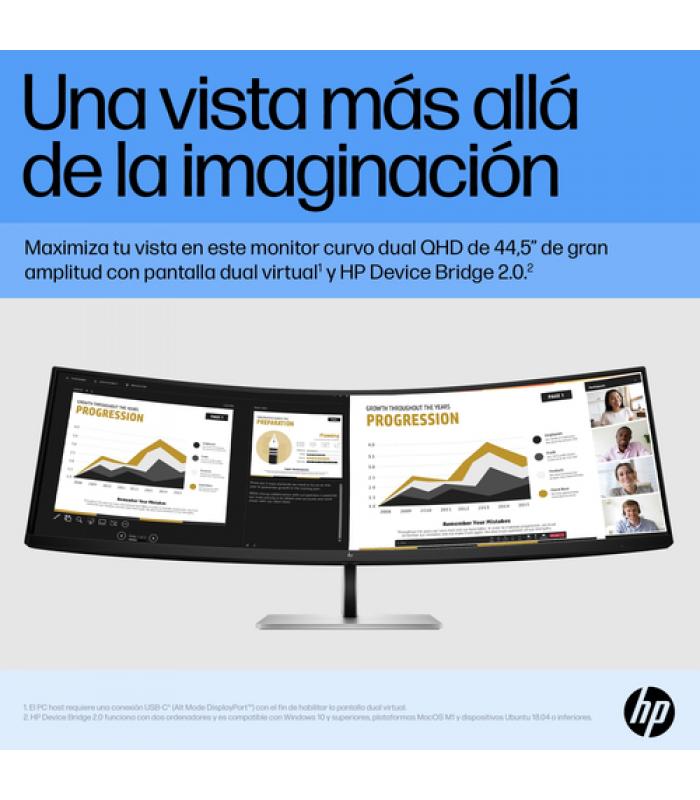 El HP E45c G5 es un monitor curvo ultra panorámico de 44.5" que redefine la productividad y la inmersión visual. Diseñado para profesionales, creadores y usuarios multitarea, combina la amplitud de una configuración de dos pantallas QHD en un solo panel curvo de alta calidad. Su resolución Dual Quad HD (5120 x 1440), frecuencia de actualización de hasta 165 Hz y tecnología AMD FreeSync Premium garantizan una experiencia fluida, nítida y envolvente tanto en tareas exigentes como en entretenimiento.