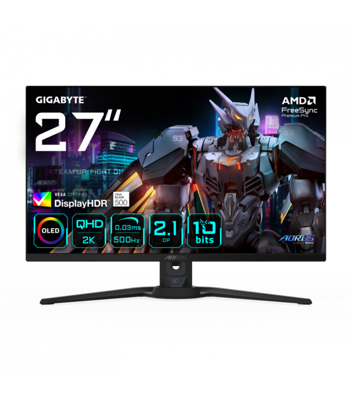El monitor AORUS FO27Q5P OLED ofrece impresionantes visuales QHD con un contraste de 1.5M:1 y color de 10 bits. Con una tasa de refresco de 500Hz, un tiempo de respuesta de 0.03ms, tecnología AMD Freesync Pro y compatibilidad con G-SYNC, garantiza un juego fluido. Este monitor también incluye protección AI OLED, herramientas tácticas, diseño ergonómico, sistema de refrigeración y KVM integrado para control de múltiples dispositivos, perfecto para entusiastas de los videojuegos.