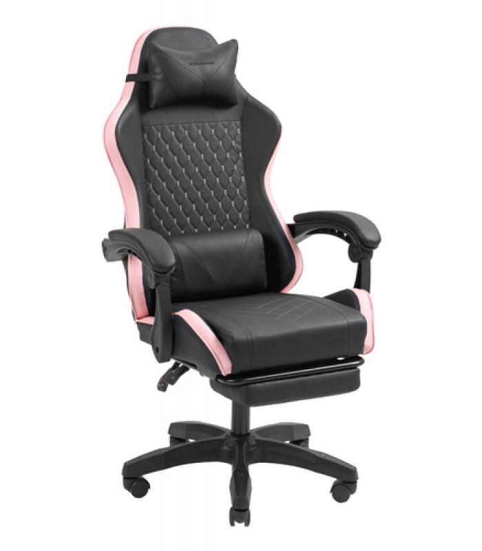 La combinación de simil piel, nylon y espuma en negro y rosa le otorga un aspecto gaming moderno y elegante. Es ideal para usuarios de hasta 120 kg y 190 cm de altura, ofreciendo una estructura estable y ajustable.
