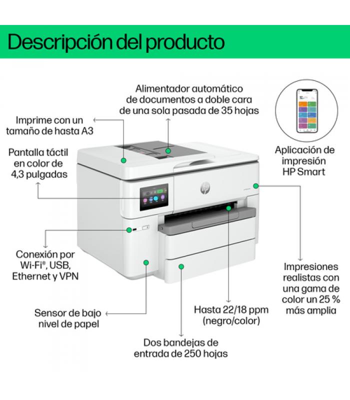 La HP OfficeJet Pro 9730e es una impresora multifunción de inyección térmica de tinta a color, diseñada para pequeñas y medianas empresas que requieren impresión en formatos de hasta A3. Ofrece funciones de impresión, copia y escaneo, con conectividad Wi-Fi, Ethernet y USB. Su diseño compacto y su capacidad de impresión a doble cara automática la hacen ideal para entornos de oficina.