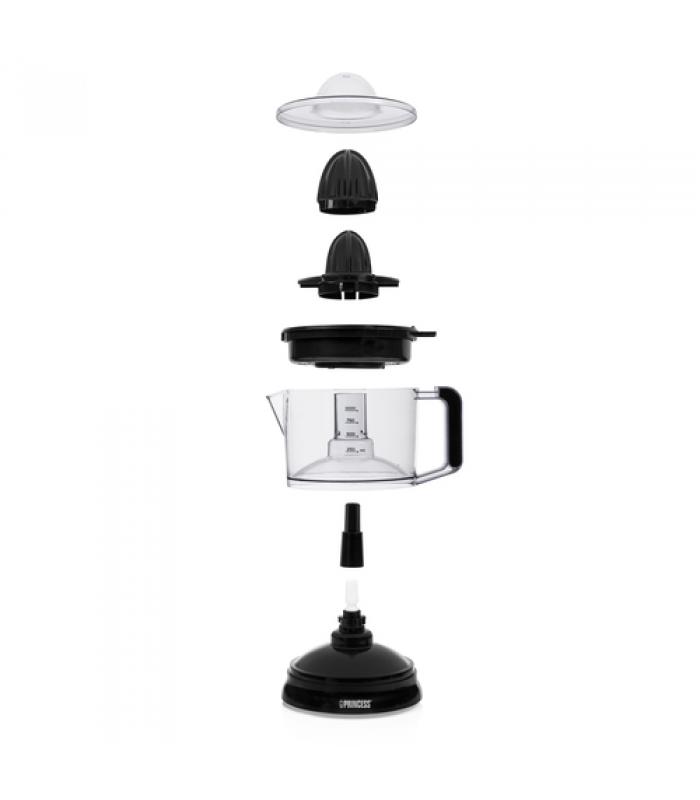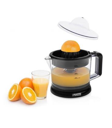 El práctico exprimidor Princess 201004 hace posible empezar el día con un vaso de zumo de naranja recién exprimido. El depósito de zumo tiene una capacidad de 1 l para poder recoger suficiente zumo para 4 vasos o guardarlo en el frigorífico. Los conos cambian entre la rotación a la izquierda y a la derecha para extraer el máximo de zumo.