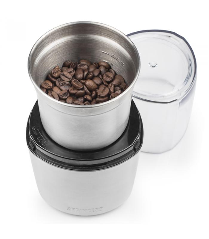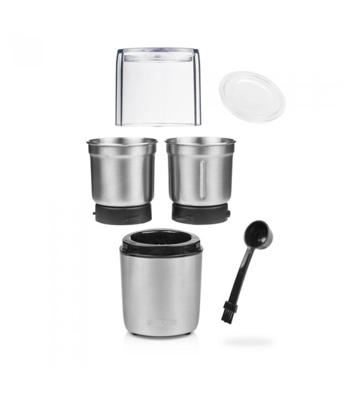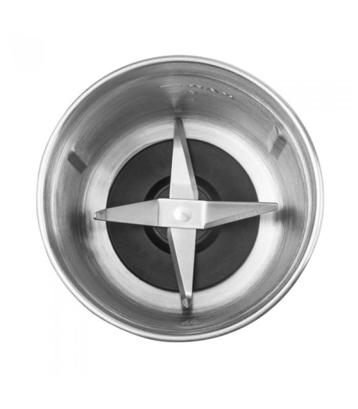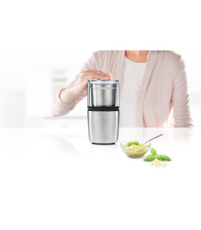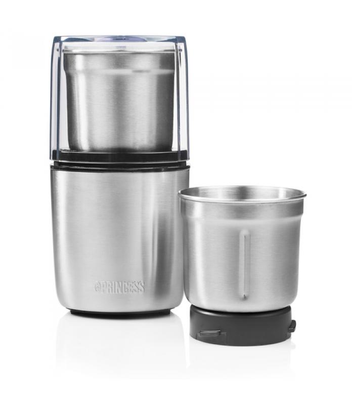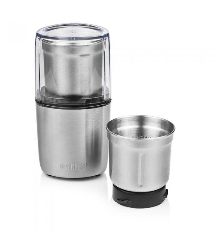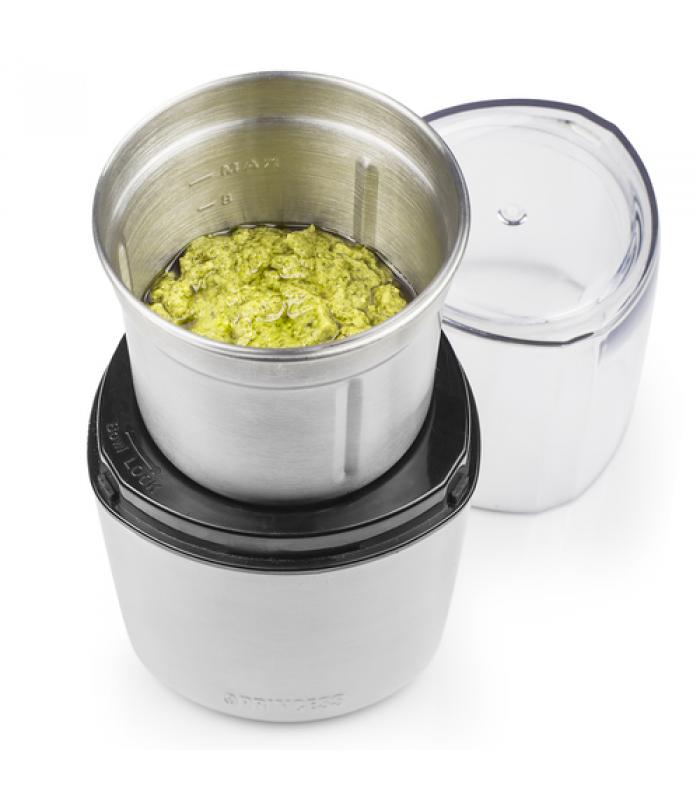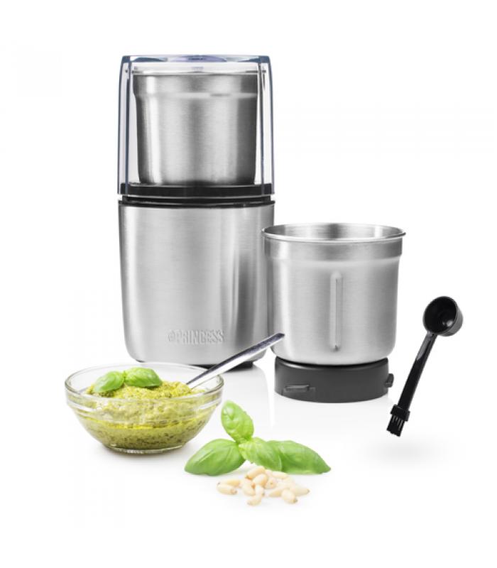 La multipicadora y molinillo Princess incluye dos recipientes y cuchillas para ingredientes secos y húmedos. Las cuchillas para moler se pueden utilizar con granos de café o especias para conseguir mezclas aromáticas. El recipiente para picar cuenta con cuatro cuchillas que pican finamente o a trozos más grandes (según el tiempo durante el que esté la picadora en funcionamiento) ajo, verduras y hierbas frescas. Ideal para preparar pesto, aceite con hierbas y pasta de curry caseros.
