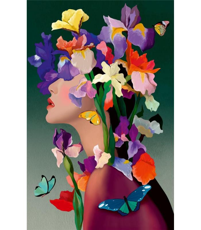 La imagen representa una composición elegante con flores iris y mariposas, creando una escena visualmente atractiva que convierte el montaje en una experiencia relajante y gratificante. Su estilo moderno lo hace también ideal para enmarcar una vez completado.