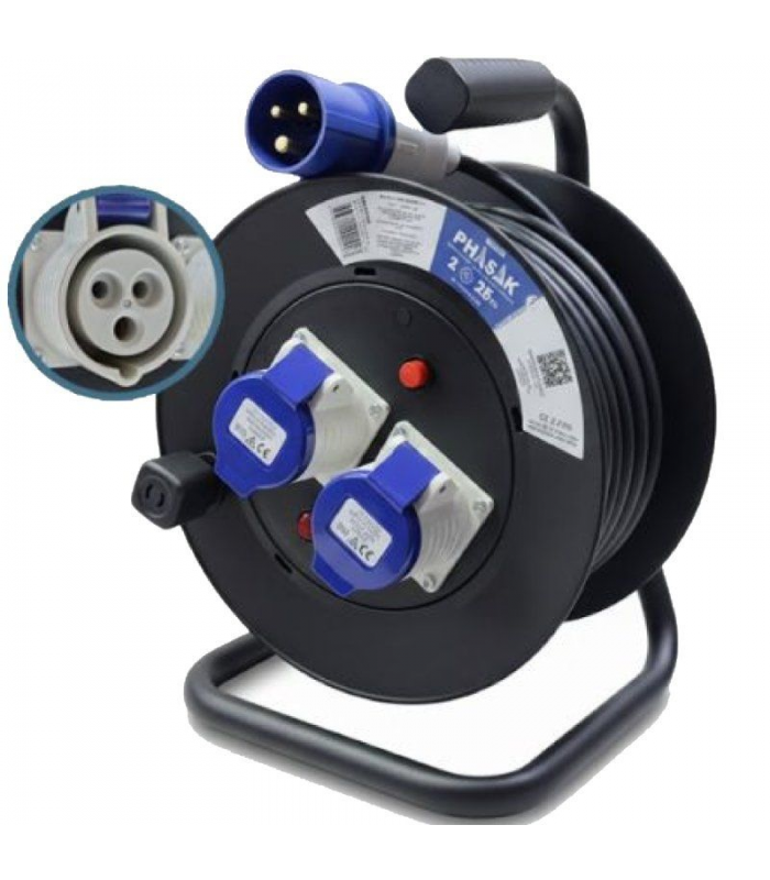 PHASAK BN 3475 es una regleta enrollable con 25 m de cable y 2 tomas industriales 2P+TT. Incorpora protección contra sobretensiones y sistema de enrollado integrado para una recogida rápida y segura.