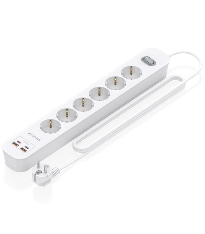 Regleta de enchufes con interruptor, 6 tomas Schuko, 2 puertos USB-C y 2 puertos USB-A. Incorpora un cable de alimentación de 1.4 metros con sección de 3x1.5mm²