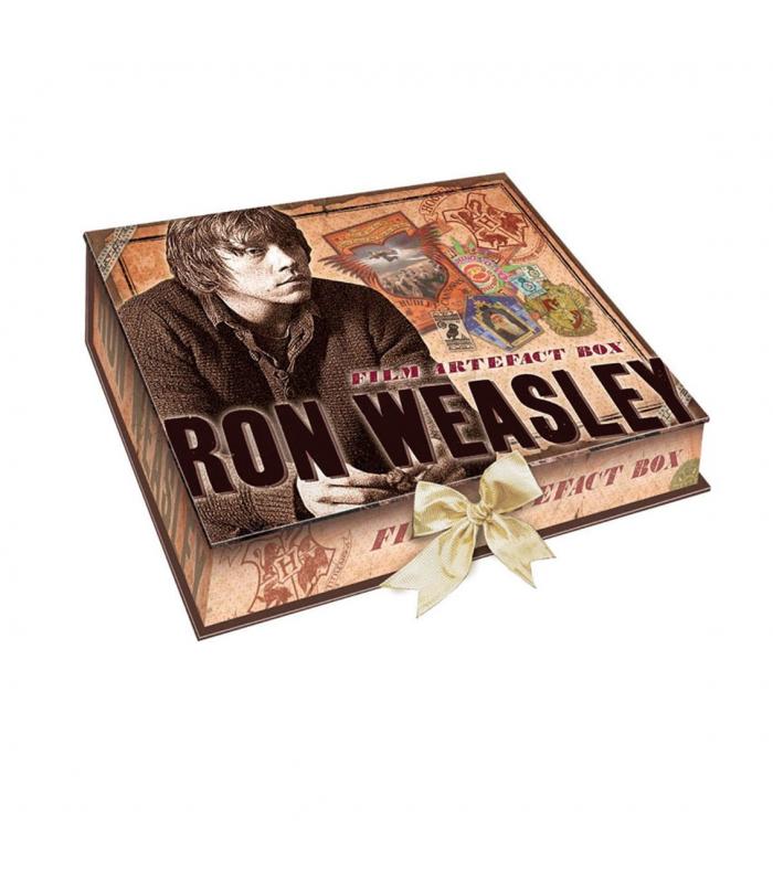 La caja de recuerdos de ron weasley incluye: parche del uniforme de gryffindor - mapa del campeonato mundial de quidditch - carta vociferadora - cromo de dumbledore - poster de los chudley - boleto de apuestas weasly y envoltorio de productos gemelos weasleypulgadaspulgadas. la caja decorada mide 20 x 28 cm aproximadamente. basada en las películas de pulgadaspulgadasharry potterpulgadaspulgadas.