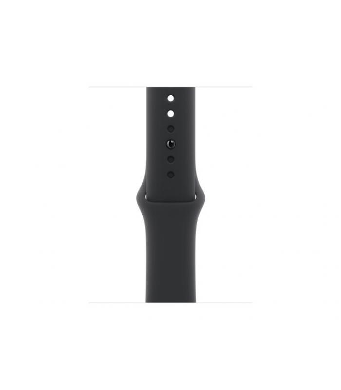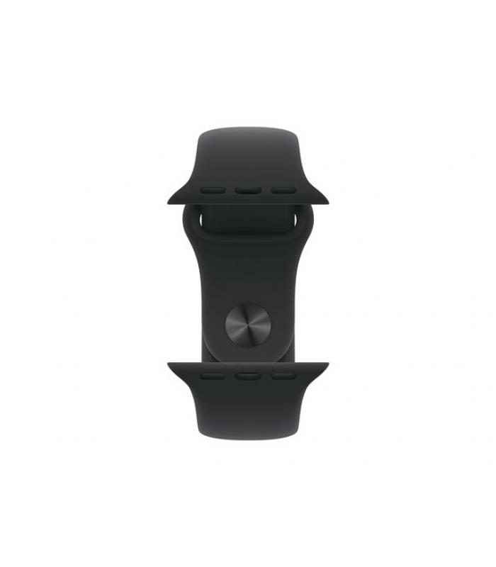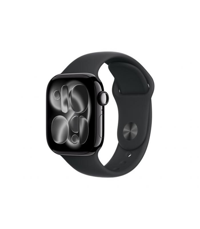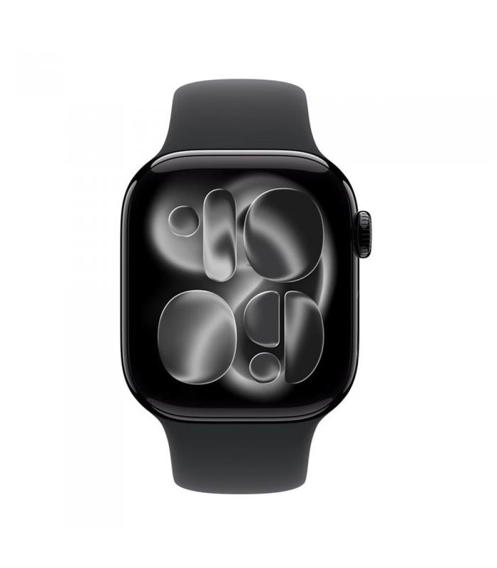 El Apple Watch Series 11 mantiene un diseño rectangular elegante con caja de 42 mm en aluminio color negro azabache. La parte trasera combina cristal de zafiro y metal para mayor resistencia. Se complementa con una pulsera deportiva de fluoroelastómero con cierre pin-and-tuck.