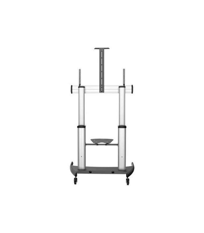 Gracias a sus cuatro ruedas con sistema de bloqueo, este soporte permite desplazar la pantalla de una sala a otra con total estabilidad. Además, cuenta con un sistema de ajuste de altura de 120 a 170 cm e inclinación de -10° a 5°, permitiendo adaptar la visualización a distintos espacios y necesidades.