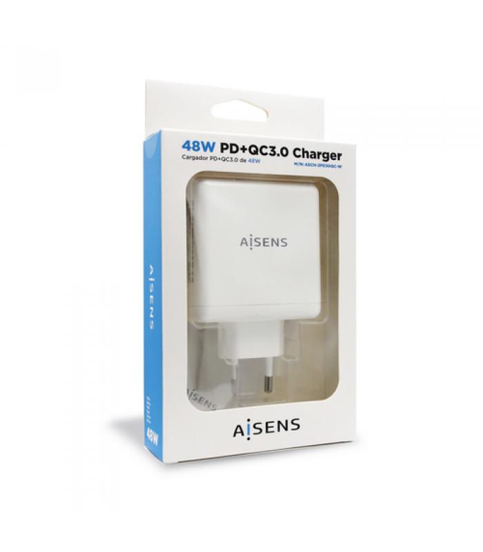 AISENS Cargador 48 W, 1x USB-C PD3.0 30 W, 1x USB-A QC3.0 18 W, Blanco, Interior, Corriente alterna, 20 V, Blanco