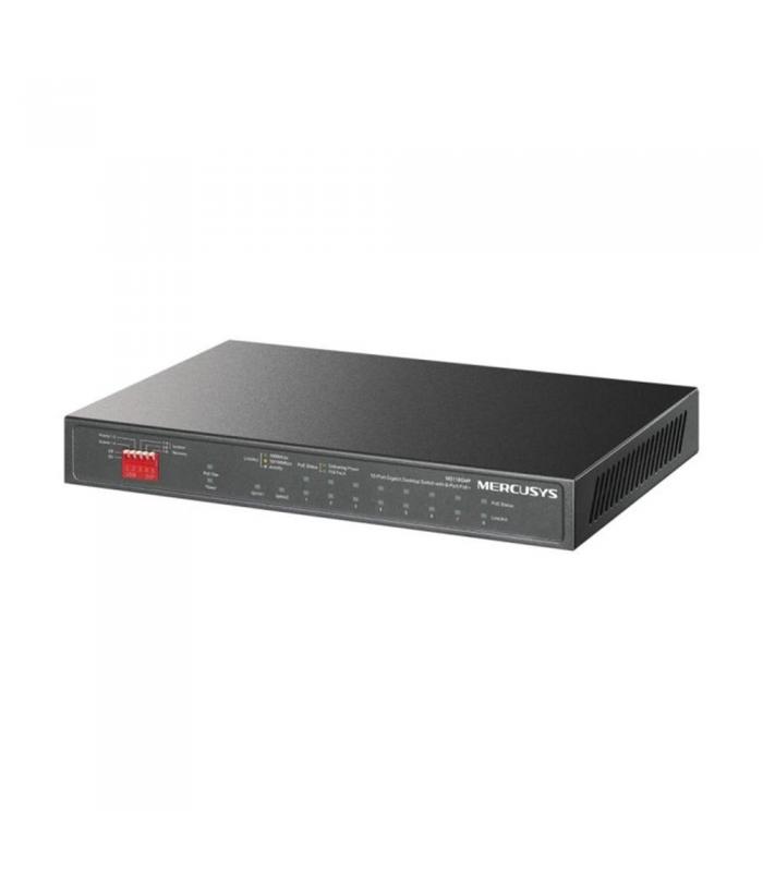 El **Mercusys MS110GMP** es un switch no gestionable de 10 puertos Gigabit diseñado para redes profesionales que requieren **alimentación PoE+ estable, fácil despliegue y funciones avanzadas de seguridad y rendimiento**. Su configuración plug & play, combinada con un diseño silencioso y sin ventilador, lo convierte en una solución ideal para **sistemas de videovigilancia, pequeñas oficinas y entornos que demandan estabilidad con mínimo mantenimiento**.