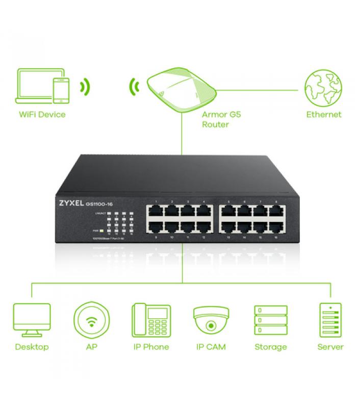 Al tratarse de un switch unmanaged, el GS1100-16-EU010 funciona mediante sistema plug & play, por lo que no requiere configuración previa. Basta con conectar los dispositivos para que la red empiece a funcionar de inmediato, simplificando la instalación incluso para usuarios sin experiencia en administración de redes.