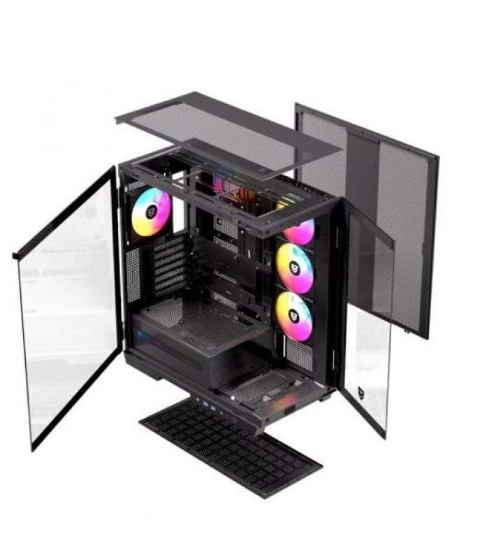 Esta caja está preparada para mantener tu sistema siempre fresco gracias a sus 4 ventiladores ARGB preinstalados de 120 mm (regulables entre 800 y 1800 RPM) y soporte para refrigeración líquida en varias zonas del chasis.