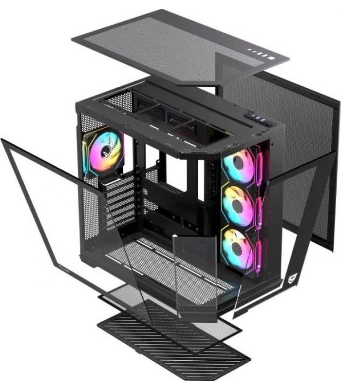 El chasis de la Nfortec Pulsar está fabricado en acero SPCC de 0,7 mm con paneles de cristal templado de 3 mm, ofreciendo una estructura sólida y elegante. Su sistema de paneles laterales se puede desmontar sin herramientas, lo que facilita el acceso al interior para montaje o mantenimiento. El efecto visual se potencia gracias a cuatro ventiladores reverse A-RGB preinstalados y al juego de espejos infinitos que aportan una iluminación envolvente.